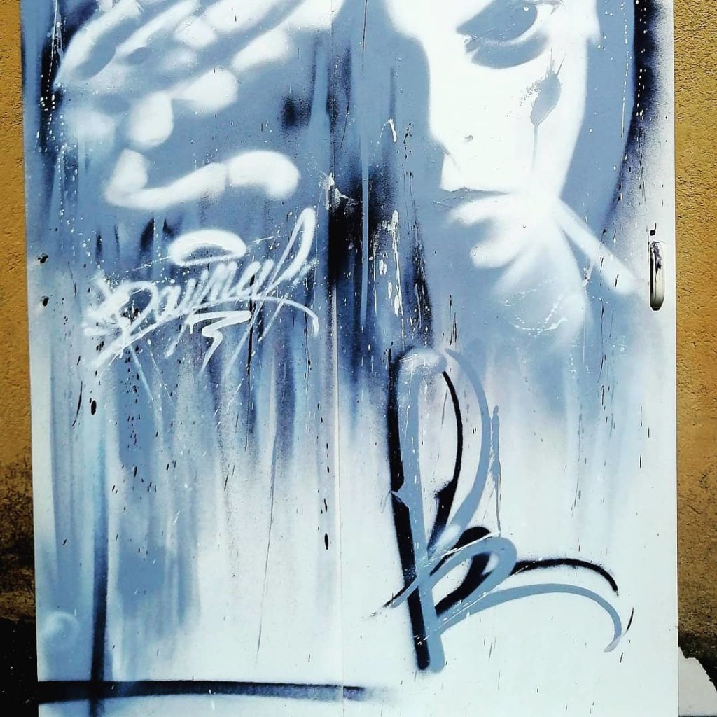 Je suis principalement graffeur, j'utilise donc des bombes de peintures, c'est ce qui me plaît le plus. Je fais aussi de l'acrylique, au rouleau, pinceaux et autres techniques sécrètes*...